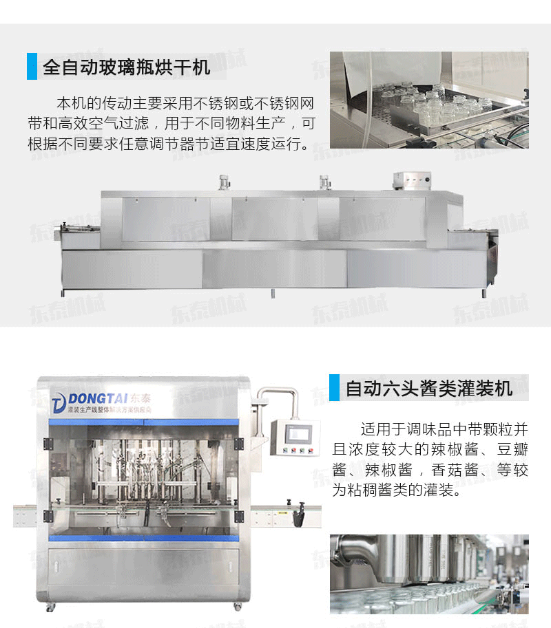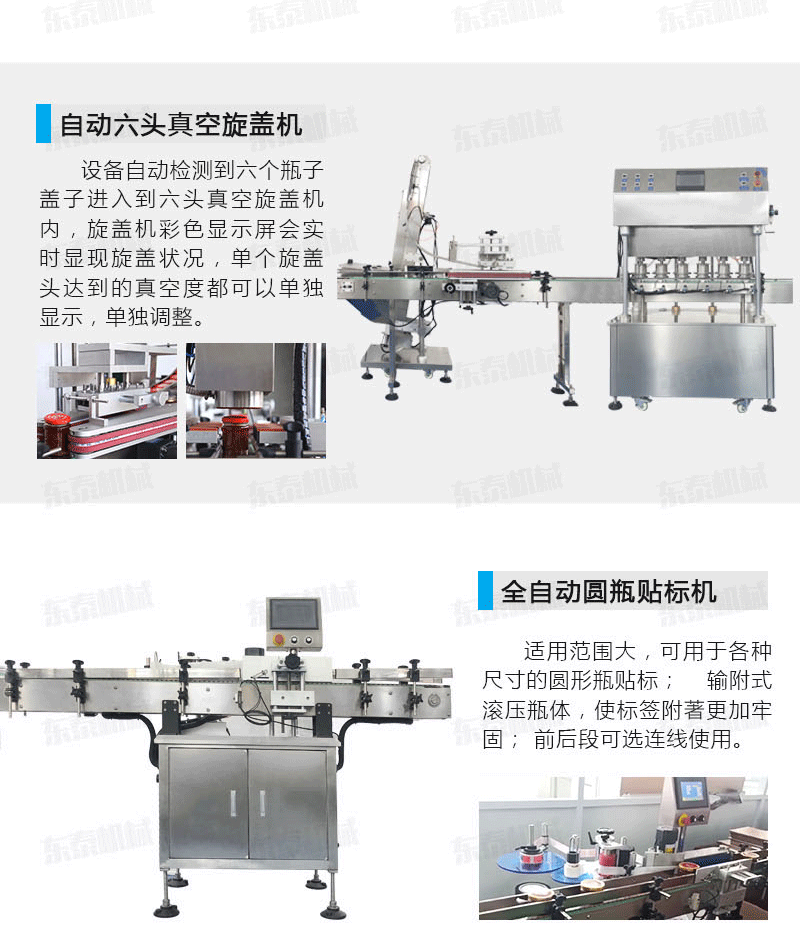 自動供瓶機(jī)+全自動滾筒洗瓶機(jī)+自動六米烘干機(jī)+自動收瓶機(jī)+全自動六頭灌裝機(jī)自動灌裝+全自動提蓋機(jī)自動理蓋、提蓋、掛蓋+六頭真空旋蓋機(jī)同時六個頭真空旋蓋+套標(biāo)機(jī)+收縮機(jī)+圓瓶貼標(biāo)機(jī)+整理平臺;