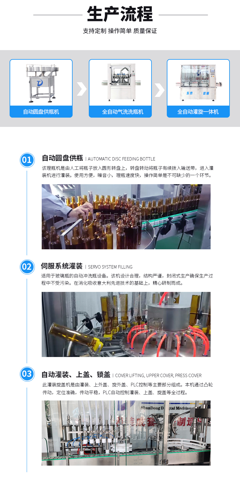 本灌裝流水線設(shè)備具有穩(wěn)定可靠、自動(dòng)化水平高,相比同類(lèi)產(chǎn)品有著更長(zhǎng)的使用年限,維護(hù)簡(jiǎn)單,整線中各設(shè)備的協(xié)調(diào)性、連貫性強(qiáng),整線設(shè)計(jì)合理等特點(diǎn)。灌裝設(shè)備采用獨(dú)家專(zhuān)利系統(tǒng)結(jié)構(gòu),為當(dāng)今行業(yè)內(nèi)水平,整線滿(mǎn)足量產(chǎn)化、集成化生產(chǎn)的需要。