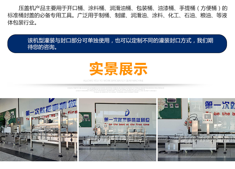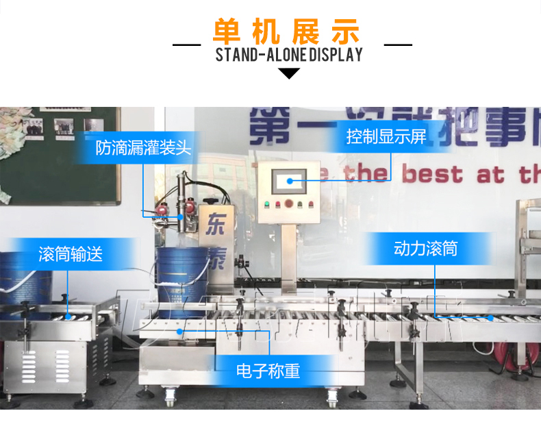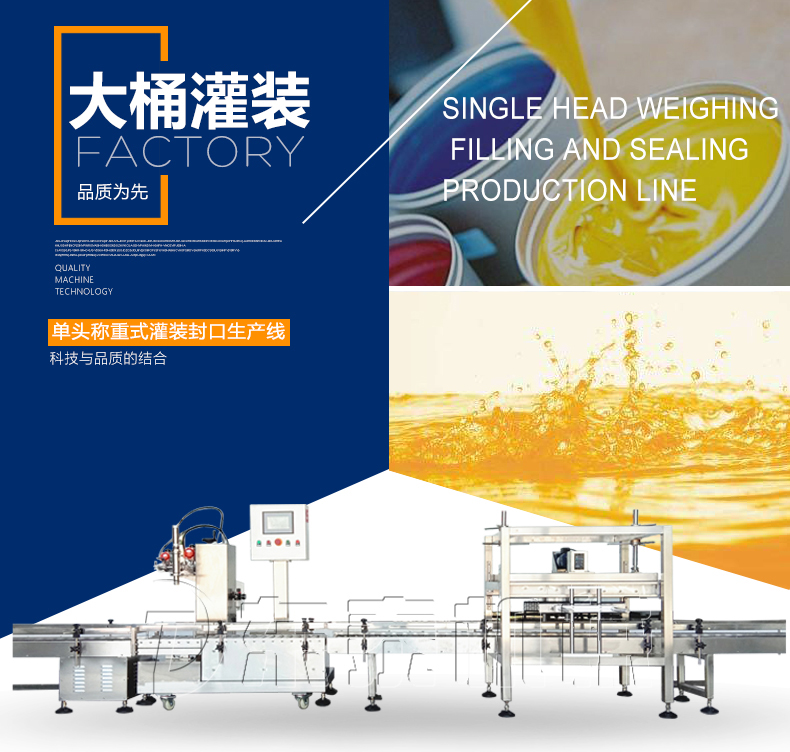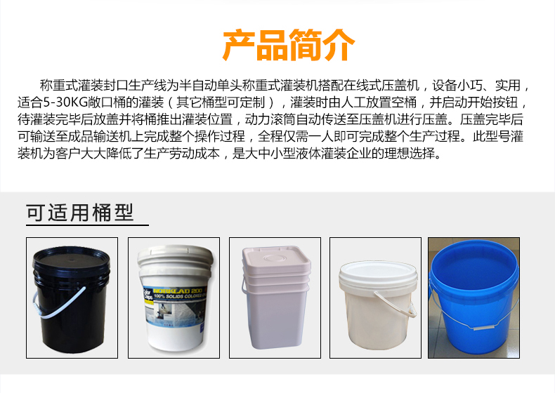 稱重式灌裝封口生產(chǎn)線為半自動單頭稱重式灌裝機(jī)搭配在線式壓蓋機(jī),設(shè)備小巧、實(shí)用適合5-30KG敞口桶的灌裝(其它桶型可定制),灌裝時由人工放置空桶,并啟動開始按鈕,待灌裝完畢后放蓋并將桶推岀灌裝位置,動力滾筒自動傳送至壓蓋杋進(jìn)行壓蓋。壓蓋完畢后可輸送至成品輸送機(jī)上完成整個操作過程,全程僅需一人即可完成整個生產(chǎn)過程。此型號灌裝機(jī)為客戶大大降低了生產(chǎn)勞動成本,是大中小型液體灌裝企業(yè)的理想選擇。